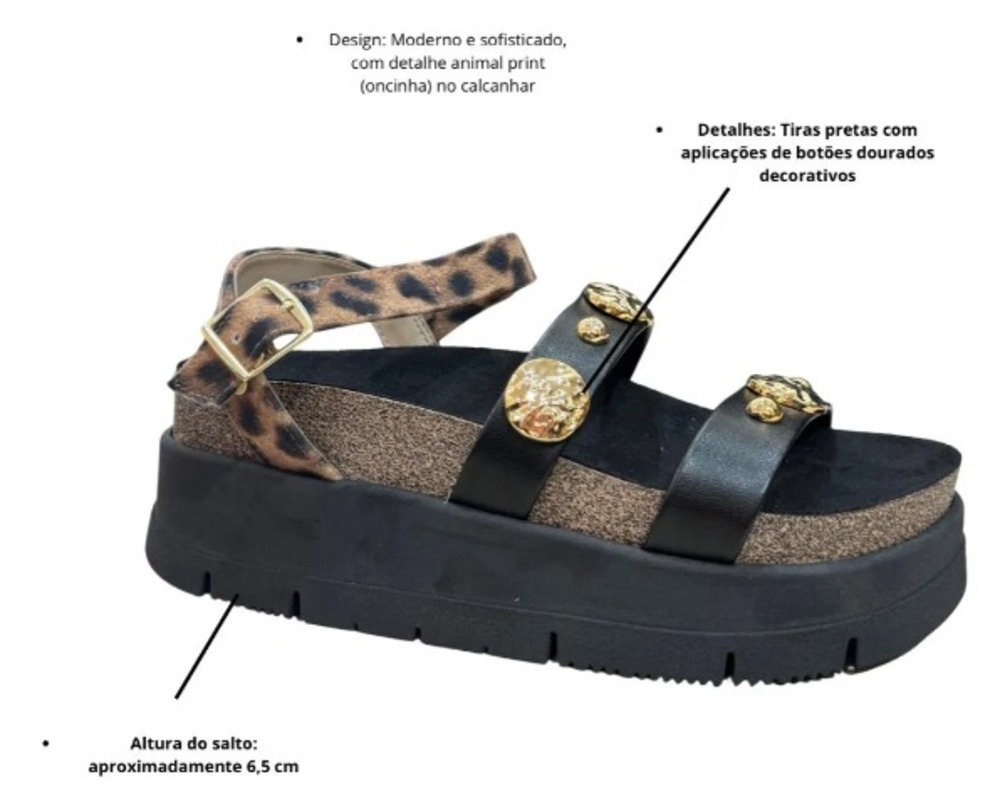 A Sandália Moleca 5513.104 é a escolha perfeita para quem busca estilo e conforto em um só calçado. Com design moderno, traz tiras em preto com aplicações douradas, combinadas ao detalhe em animal print no calcanhar, garantindo um visual sofisticado e cheio de personalidade.